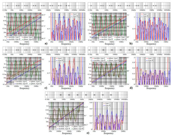 This section brings numerical values of the circuit components for different realizations of CPEs. Individual mathematical orders are provided as the sub-sections in ascending order; beginning with phase shift 9° (α = 1/10, behavior very close to resistor) and ending with 81° (α = 9/10, i.e., motion close to capacitor, inductor, ideal integrator, or differentiator). The total amount of 19 non-integer orders are chosen with respect to practical applications; each one represents a significant fraction between zero and one. Tabularized numerical values provided in each sub-section represent complete knowledge about behavior of developed wideband CPE in the form of RC passive-only ladder structure. Values provided for resistors and capacitors are calculated using algorithm described in fundamental papers [,] and rounded conveniently. Then, location of first and last zero-pole pair is slightly adjusted to enhance approximation bandwidth as much as possible. Concrete time constant of CPEs should be composed by series-parallel interconnection of real passive components taken from commercially available fabrication series with minimal tolerances (ideally 0.1% and/or 0.5% at maximum). Numerical values of CPEs are calculated so that the fundamental property of CPE, pseudo-capacitance or pseudo-inductance, is not considered for calculations and unified. This is, in fact, a value of module measured at angular frequency 1 rad/s, i.e., frequency 159 MHz Thus, it can be verified directly in the module frequency responses of the individual CPEs. For type I RC structure, module of CPE admittance is equal to 1/RP at DC frequency. For type II RC network, admittance of CPE is defined at very high frequencies and equals 1/RS.