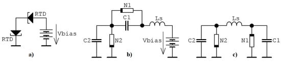 Different structures of the analyzed memory: (a) principal concept, (b) high frequency model, (c) electronic circuit after transformation of AVC of both RTDs toward origin.