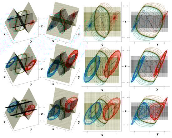 Let’s see what kind of vector field geometry forms double-scroll attractor newly presented in this paper. This attractor occupies all affine segments of the state space, i.e., dynamics of memory is uniquely determined by eigenvalues and eigenspaces associated with all fixed points. For numerical set of parameters given above, formula (11) returns the following results: saddle-focus with unstable eigenplane in blue segments in the sense of Figure 9c, a full saddle focus repellor with spiral movement in orange areas, stable spiral combined with stable vector movement in brown regions, and finally a saddle node with stability index one within the yellow region.