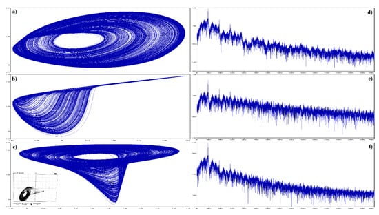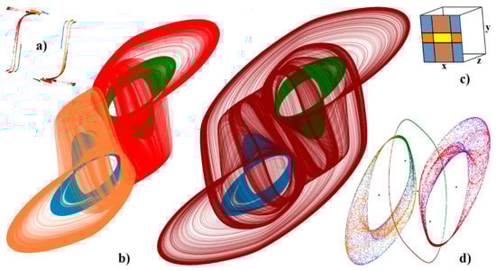 A key feature of chaos is the extreme sensitivity of the system behavior to the tiny changes of initial conditions. This unique property is proved in Figure 9d, where five groups of 104 initial conditions were integrated with a final time of 100 and time step of 0.1 (ending state is plotted). Each group is generated in the close neighborhood of some fixed point (black dots) distinguished by colors (xe1 red, xe2 blue, xe3 green, xe4 orange, and xe5 brown) using normal distribution with mean deviation 10−3. Note that self-excitation process of the limit cycle and both mirrored single-spiral attractors is verified.