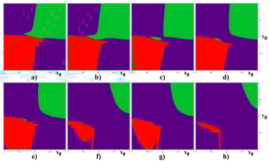 BA of analyzed memory with basic set of parameters (g2outer = 20 S) leading to the separated single-spiral attractors, horizontal slices of state space defined by the planes: (a) z0 = 0, (b) z0 = 1, (c) z0 = 1.5, (d) z0 = 2, (e) z0 = 3, (f) z0 = 4, (g) z0 = 5, and (h) z0 = 6.