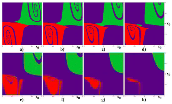 BA of analyzed memory with basic set of parameters (g2outer = 18 S) leading to the separated single-spiral attractors, sandwiched horizontal slices of state space defined by the following planes: (a) z0 = 0, (b) z0 = 1, (c) z0 = 1.5, (d) z0 = 2, (e) z0 = 2.5, (f) z0 = 4, (g) z0 = 5, and (h) z0 = 6.