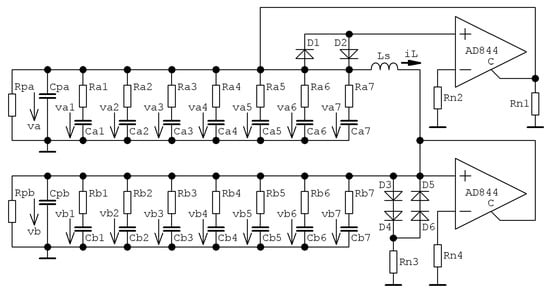 where the components of column vector f are f1(v1) and f2(v2) given by PWL function (9). Numerical values of components Rpa, Cpa, Rpb, Cpb, Rak, Cak, Rbk, Cbk for k = 1, 2, …, 7 can be adopted directly from Section 3 of this paper. The chaotic oscillator is designed so that only off-the-shelf electronic components are required. Used diodes are BAT 63 because of the low forward voltage of about 200 mV. Buffered voltage output of the integrated circuit AD844 can be utilized to trace voltages across FO capacitors. The whole network is fed by using symmetrical ±15 V voltage supply. Note that only integer-order nature of memory´s lead inductance is assumed.