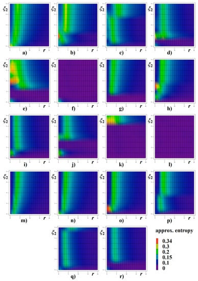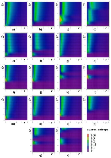 Approximate entropy calculated for memory with two CPEs of equivalent orders α = β, associated impedance norms ξ1, ξ2 and threshold r: (a) α = β = 8/9, ξ1 = 1, (b) α = β = 8/9, ξ1 = 2, (c) α = β = 8/9, ξ1 = 3, (d) α = β = 8/9, ξ1 = 4, (e) α = β = 8/9, ξ1 = 5, (f) α = β = 8/9, ξ1 = 6, (g) α = β = 4/5, ξ1 = 1, (h) α = β = 4/5, ξ1 = 2, (i) α = β = 4/5, ξ1 = 3, (j) α = β = 4/5, ξ1 = 4, (k) α = β = 4/5, ξ1 = 5, (l) α = β = 4/5, ξ1 = 6, (m) α = β = 7/9, ξ1 = 1, (n) α = β = 7/9, ξ1 = 2, (o) α = β = 7/9, ξ1 = 3, (p) α = β = 7/9, ξ1 = 4, (q) α = β = 7/9, ξ1 = 5, (r) α = β = 7/9, ξ1 = 6.
