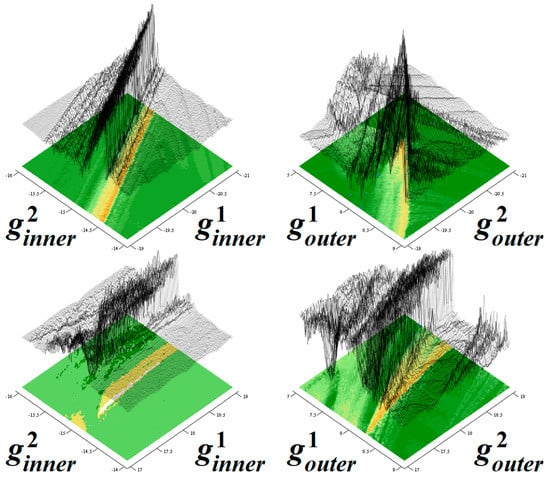 Figure 15 provides graph of LLE as a function of slopes of both PWL functions. The minimum value of LLE is −0.09 and the maximum value is 0.153. The colored scale is as following: dark blue areas represent fixed point solution, green stands for limit cycle solutions, yellow and white denotes weak (LLE lower than 0.1) and strong (LLE greater than 0.1) chaos behavior. Since three-segment odd-symmetrical PWL functions∈ are considered for memory, this plot represents four-dimensional hypercube with edges g1inner∈(−21, −19), g1outer∈(7, 9), g2inner∈(−16, −14), g2outer∈(17, 19) and resolution 201 × 201 × 201 × 201 points. For this calculation, the fourth-order Runge-Kutta method in Matlab. Final time for integration was set to 1000 with transient behavior omitted.