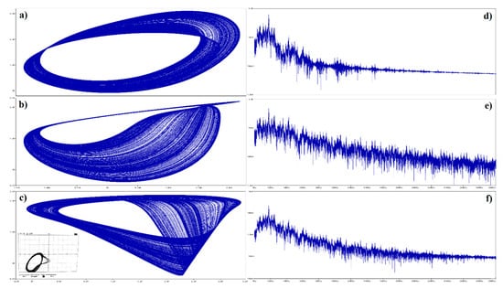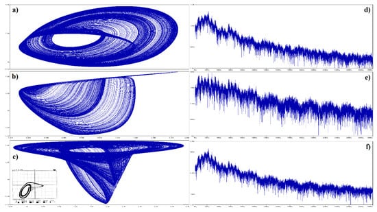 Orcad Pspice circuit simulation of IO memory in robust chaotic regime; plane projection: (a) vC1 vs. iL, (b) vC2 vs. iL, and (c) vC2 vs. vC1 together with the experiment; frequency spectrum of generated signal: (d) vC1, (e) vC2, and (f) iL.