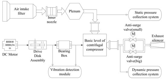 The diagram of the data acquisition system is shown in Figure 3. In the system, the centrifugal compressor is driven by an 800 kW DC motor. The number of diffuser blades is 24, the number of impeller blades is 16, and the Mach number of the airflow in the pipeline is 0.6. Firstly, the outside air enters the pipeline through the intake filter, inner nozzle and chamber. After this, the filtered air is compressed by the centrifugal compressor. Finally, the compressed air is expelled into atmosphere through the exhaust muffler and outlet pipe by controlling the opening-degree of the two electric anti-surge valves with diameters of 250 mm and 100 mm. In the experiment, as the opening-degree of the anti-surge valves is decreased gradually, the centrifugal compressor will transit from a stable state to an unstable state. The dynamic pressure acquisition experiment lasts for 635.5 s, and the states of the centrifugal compressor changed from stable state to surge, and then to stable state again.