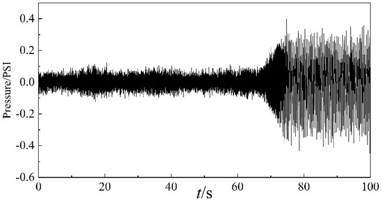 In this study, the data from 200 s to 300 s are used, including the stable state, transition state, and surge state of the centrifugal compressor. The time sequence of the dynamic pressure is shown in Figure 4, and it is clear that with the anti-surge valve fully open, the centrifugal compressor operates in a stable state during the first 68 s. In this situation, the fluctuation of the dynamic pressure is faster and the amplitude of the waveform is smaller. With a decrease in the opening of the anti-surge valve, the fluctuation slows down and the amplitude of the waveform begins to increase gradually just after 68 s. In the interval between 68 s and 75 s, the system operates in a transition state, and surge occurs near to 75 s.