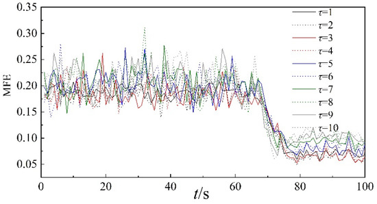 The multi-scale fuzzy entropy curves based on the dynamic pressure with different scales are shown in Figure 5. In the diagram, the scale factor τ is set from 1 to 10, and the analysis unit is one second. From Figure 5, it can be seen that the curves of MFE begin to decrement at 68 s and tend to be stable at 75 s for all scale factors. The time point of the state change for MFE is consistent with that of the time domain waveform of dynamic pressure. Therefore, multi-scale fuzzy entropy can be used to describe the nonlinear characteristics of dynamic pressure. After studying the curves in Figure 5, it is clear that there are overlapping phenomena in the multi-scale fuzzy entropy curves under different scale factors, and the scale characteristics of the scale factor are not obvious.