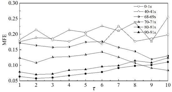 In order to better visualize the scale characteristics of scale factors, the relationship between multi-scale fuzzy entropy and scale factor τ of the dynamic pressure is analyzed further, as shown in Figure 6. For this analysis, six time periods in different stages are used, that is, stable state (0–1 s, 40–41 s), transition (68–69 s, 70–71 s) and surge state (80–81 s, 90–91 s). From Figure 6, it can be seen that MFE differs greatly among the three stages, and the values of MFE are largest for the stable stage and smallest for the surge state at lower scale factors. The difference between the stable state and surge is significant for all scale factors. With the increase of the scale factor, the curves of the transition state intersect with the curves of the other two states. Consequently, it is somewhat difficult to distinguish the transition state from the other states of the system.