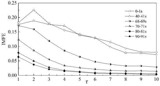 Then, the relationship between IMFE and scale factor τ for the dynamic pressure at the outlet is analyzed. In Figure 8, the same six time periods as in Figure 6 are used. In contrast with the curves of MFE, the values of IMFE are largest for the stable stage and smallest for the surge state for all scale factors, the curves under the different states are smooth, the curves decrease with the increase of the scale factor for all three states and there is no intersection between curves for different states. Therefore, IMFE makes it easier to identify the different working states of a centrifugal compressor. Furthermore, it can be drawn that IMFE is a much more reliable solution to analyzing the characteristics of the centrifugal compressor in different states, because the values of entropies of the stable state and transition state are very close, as the scale factor is one.