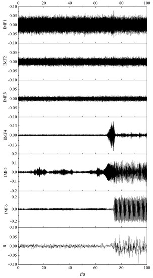 In order to test the statistical reliability of the IMFE of IMF components, the data of dynamic pressure are modified by adding randomly shuffled data. According the maximum absolute data of the dynamic pressure, white noise with an amplitude of 0.02 PSI is chosen as the randomly shuffled data. EEMD decomposition of the randomly shuffled dynamic pressures is shown in Figure 16, including six IMF components and a residual component R. The same conclusion is drawn from Figure 16 as from Figure 9, which infers that the noise has no influence on the analysis result obtained from the method.