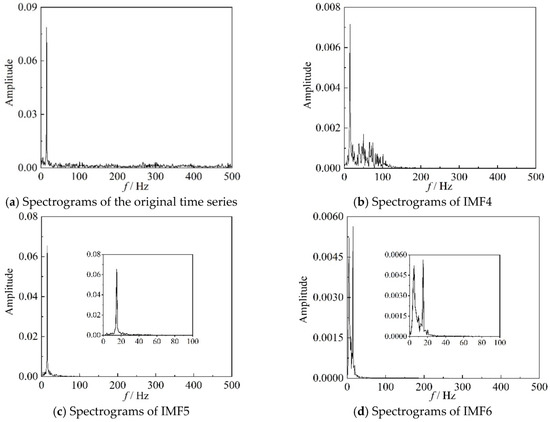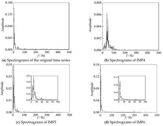 After EEMD decomposition, the correlation between IMF components and the original data is measured by the correlation coefficient in the frequency domain. Compared with time domain analysis, frequency domain analysis is more convenient, significant, and concise. The correlation coefficient ρ in the frequency domain can be expressed as follows [20],