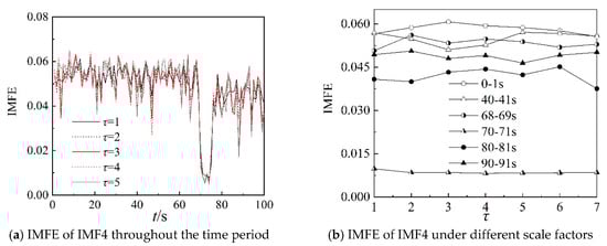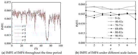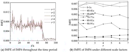 Because the characteristics of IMF4, IMF5, and IMF6 can clearly describe the working state of the centrifugal compressor in the frequency domain, the IMFE of the three IMF components are analyzed further in this section. Figure 13, Figure 14 and Figure 15 show the IMFE of the IMF components for the original time sequence of dynamic pressure. Part (a) of each figure shows the IMFE of the IMF components throughout the time period, and part (b) shows the IMFE of the IMF components under different scale factors of the six time intervals, namely, 0–1 s, 40–41 s, 68–69 s, 70–71 s, 80–81 s, and 90–91 s.