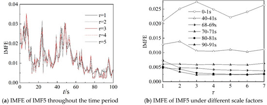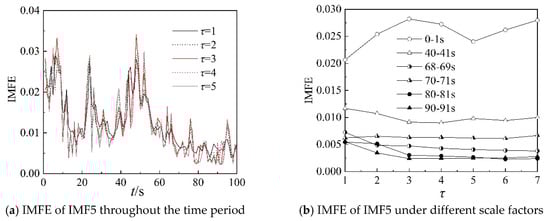 Figure 17, Figure 18 and Figure 19 show IMFE of the IMF components for the shuffled dynamic pressure. Part (a) of each figures shows the IMFE of IMF components throughout the time period, and part (b) shows the comparison of the original and randomly shuffled dynamic pressure in IMFE of the IMF components, under different scale factors for the six time intervals, at 0–1 s, 40–41 s, 68–69 s, 70–71 s, 80–81 s, and 90–91 s. Moreover, the variation in the IMFE of IMF components shows properties consistent with the results for the original time sequence. In part (b) in Figure 17, Figure 18 and Figure 19, the curves also show consistent properties graphically with the curves of part (b) in Figure 13, Figure 14 and Figure 15, except for small errors.