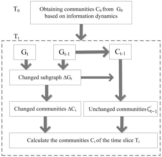 Building upon the proposed information dynamics model, we construct a dynamic community detection framework. Figure 2 illustrates the rationale of dynamic community detection based on information dynamics, which consists of two parts: initial community detection and incremental community detection. First, the initial communities are obtained by using the information dynamics model at time slice , and then the dynamic community detection at time slice is performed. Next, we introduce the specific process of dynamic community detection based on information dynamics.