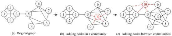 - Add Nodes. Adding nodes refers to the new nodes added to the current time slice network compared with previous time slice network . Let denotes the set of added nodes, which is defined as follows:where and represent the set of nodes in the networks and , respectively. The added nodes can be calculated by solving the difference set of these two sets. What is the impact of adding a new node to the community structure in the network? When the added node is within one community, the original community structure will not change [35,36]. As shown in Figure 3b, adding a node inside one community increases the connection density of the community, and the number of communities has not changed. Therefore, it is only necessary to divide the added nodes into the current community.