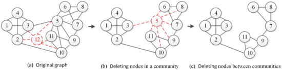 - Delete Nodes. The deleted node refers to a node that is removed in the current time slice network compared with the previous time slice network . Let represent the set of deleted nodes, which is given by the following:The deleted nodes can be computed by solving the difference set between sets and . Figure 4 shows one node deletions within the community and between communities, respectively. We can observe that the deletion of a node within one community or between the communities has caused changes in the structure of the community. Therefore, when deleting a node, we need to add the deleted node and the connected communities to the subgraph .