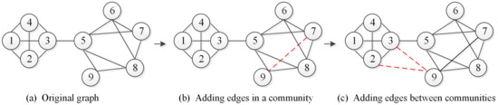 - Add Edges. Similarly, the added edges correspond to the new edges in the current time slice network compared to the previous time slice network . Formally, we define the added edges as follows:where and represent the set of edges in the networks and , respectively. Figure 5b shows that adding an edge within the community enhances the density of the edges inside it and does not change the structure of the community. Therefore, it is not necessary to deal with the new edges added. However, the addition of edges between communities may lead to changes in community structure. Figure 5c illustrates that the added edges between communities have led to the merger of this two communities into one community.