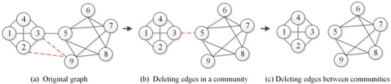 - Delete Edges. The deleted edge refers to the edge removed in the current time slice network compared to the previous time slice network . Let denote the set of deleted edges, which is defined as follows:Deleting edges within one community may lead to changes in the community structure. As shown in Figure 6b, deleting the inner edge causes the community to split. Therefore, we need to add the current edge and the community involved to the subgraph . In contrast, deleting the links between the communities weakens the connection between them, which does not cause changes of the original communities. Figure 6c shows an edge deleted between communities, and the communities have not changed. Therefore, there is no need to process the deleted edges and related communities.