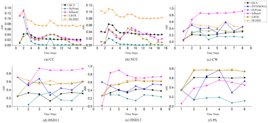 - Compute Unchanged Communities . Based on the acquired networks and , we can calculate all the communities and the communities that may change at the time slice. Therefore, the unchanged communities can be obtained by calculating the difference set of the two sets.