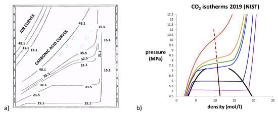 In addition, shown in Figure 1 is a point, labelled “critical state”, which has not been defined thermodynamically, i.e., by intersection of state function loci. At a critical temperature Tc, there is deemed to be a merging of the properties of the gas and liquid states in coexistence. At a critical temperature Tc, Andrews proposed the hypothesis of “continuity of liquid and gas” [2]. He suggested that there is no distinction between gas and liquid at or above Tc and hence definitive state bounds along any supercritical isotherm. The experimental pressure measurements for CO2, as a function of density and temperature, in the original paper by Andrews are shown in Figure 2a.