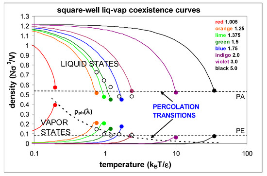 The supercritical mesophase was discovered originally from computer experiments on model square-well (SW) fluids, which can be understood as a perturbation of the hard-sphere (HS) fluid. The hard-sphere fluid exhibits two percolation transitions of the excluded volume (PE) and accessible volume (PA), between which both complementary volumes (VA + VE = V) percolate the phase volume. Although the HS fluid has a well-defined mesophase, it cannot account for gas-liquid condensation and 2-phase coexistence without an attractive potential term. The SW-model molecular Hamiltonian is defined by adding a constant energy of attraction (ε) of finite width (λ) to a HS (diameter σ) pair potential. The range must be finite, and not infinite, as implicit in the attractive term of van der Waals equation and similar mean-field theories, to give a fluid that complies with thermodynamic laws. The SW attraction introduces another percolation transition of cohesive gaseous clusters, the density of which depends upon the range of the attraction λ, as also shown in Figure 3. Properties of square-well fluids of various values of well-width λ have been reported from computer experiments. The simulation data shown in Figure 3 are taken from references [6,7,20,21,22,23,24,25]. These results from computer experiments are reproduced from the original reports of the existence of the supercritical mesophase [6,7].