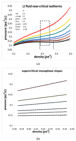 Critical and supercritical pressure isotherms of the Lennard–Jones fluid from reference [25]. (a) Isotherms showing the linear mesophase regions (dashed rectangle) between gas-like and liquid-like states of decreasing and increasing rigidities. (b) Expanded dashed rectangle region in (a) for 50 state points along each isotherm within the mesophase.