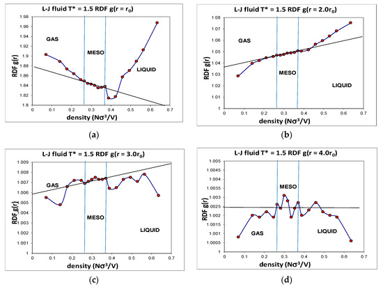 Another advantage of computer simulation is that detailed structural data can be obtained that helps to explain the phenomenological behaviour at the molecular level. The Lennard–Jones fluid was found to have a critical isotherm at kTc/ε = 1.3365 ± 0.0005 (where k is Boltzmann’s constant and ε is the attractive minimum energy of the L-J pair potential). Several supercritical isotherms were studied in more detail with a very high precision, including the kT/ε = 1.5 isotherm over the whole density range. Accurate structural information was obtained, including the radial distribution functions (RDFs) over the whole density range. Although individual state point RDFs are of very high statistical precision, they do not reveal any information about subtle structural changes that must inevitably accompany the onset of hetero-phase fluctuations, and the higher-order order percolation transitions. When the normalized pair probabilities g(r) at specific interatomic distance (r) are viewed as a function of density, however, a picture of the three supercritical regions, with the mesophase, emerges. The detailed density-dependent structural properties (Figure 5) show the unequivocal evidence that there exist three distinct structural state regions, liquid, meso and gas. The g(r,ρ) also reveals the evidence of the hetero-phase fluctuations that are the precursor states to the percolation transitions. The structural data reproduced in Figure 5 show that at all intermolecular distances from highly repulsive overlap to long-range distances of four times the most probable pair distance, there are extremely slight, but statistically significant, structural differences, between gas, liquid and meso, as evidenced by the subtle deviations from uniform probabilities as a function of density along a supercritical isotherm.