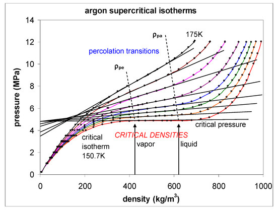To demonstrate that the percolation state bounds, which can be clearly defined and seen in computer experiments [6,7], exist also in real fluids, we only need to consider one such fluid as a test case. Take, for example, the experimental measurements from Gilgen et al. for argon [50,51]. The data points in Figure 9 are plotted directly from the published data in reference [50]. Except in the immediate vicinity of the critical temperature (i.e., within 0.1K), these data are reported with six-figure accuracy. The loci of the two percolation transitions are obtained from the discontinuity in the slope of the p(ρ) isotherms, for the seven supercritical isotherms shown. The percolation transitions define the bounds of existence of the supercritical gas and liquid phases. The critical isotherm is horizontal between the maximum gas density of coexistence and the minimum liquid density at Tc.