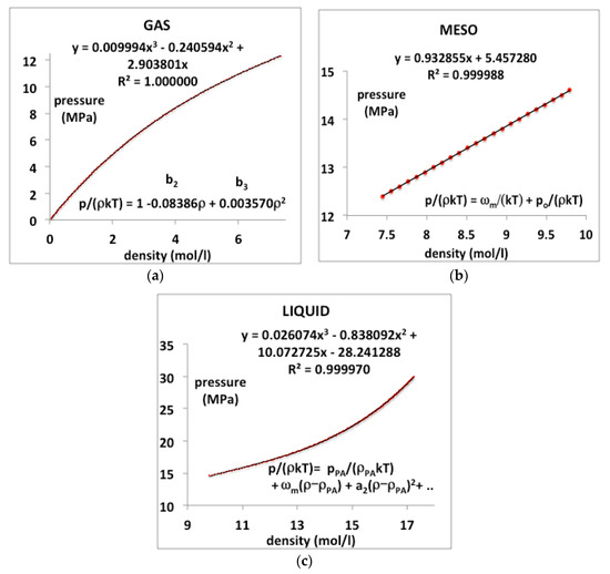 The experimental data from the NIST tabulations are reproduced in Figure 12 with the same precision as the original data can be obtained, i.e., accurate to 5 or 6 figures, as evidenced by the mean-squared regression (R2) in the trendline polynomial coefficients as given. In addition, shown in Figure 12 are redefined equations to give the virial coefficients as shown on the plots. The coefficient a1 in the liquid-state expansion is taken to be equal to the value of wT in the mesophase to describe the third-order discontinuity between the mesophase and the liquid state. There is a symmetry between the rigidity of gas and liquid on either side of the mesophase. This observation is empirical though it has a molecular origin in the fluctuations of the available volume and its relationship to the chemical potential of both gas and liquid states [52].