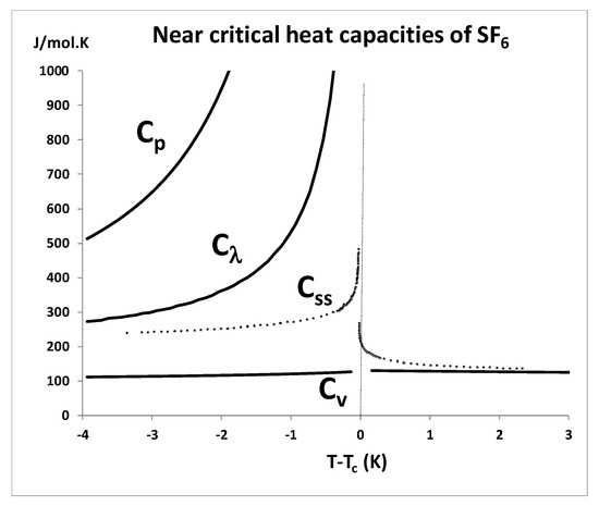 This also applies to the micro-gravity experimental measurement of a heat capacity for SF6 along a near critical isochore aboard the NASA space shuttle [59]. The publicly available data points of the NASA Space shuttle experiment are shown in Figure 15 alongside the heat capacities Cp, Cv and Cλ [4]. A comparison shows that what was actually measured in the space-shuttle experiment (labelled Css) relates to Cλ a few degrees below Tc, and to Cv a few degrees above Tc, but is possibly made to look like a lambda-transition in the vicinity of Tc by the stirring or steady-state emulsification.