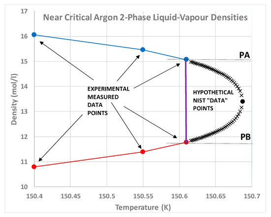 Nobody has ever reported a direct observation of a critical density [5]; this is well illustrated by the extensive high-precision experimental measurements of the argon liquid-vapour coexistence densities by Gilgen et al. [51]. The highest temperature for which they report both coexisting vapour and liquid densities is 150.61 K. They use a cubic scaling equation and a law of rectilinear diameters to obtain their critical point temperature (150.69 K), and critical density of 535.6 kg/m3. The mean of the two extreme recorded liquid and vapour densities is 536 kg/m3. The lowest co-existing liquid mass density they report is 602 kg/m3. The highest vapour mass density they can observe near Tc is 470 kg/m3. The line of critical states connects these two points (Figure 9).