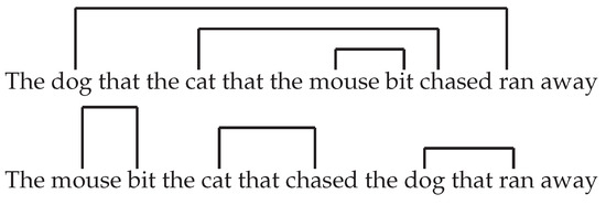 - Christiansen, M.; Chater, N. Toward a connectionist model of recursion in human linguistic performance. Cogn. Sci. 1999, 23, 157–205. [Google Scholar] [CrossRef]