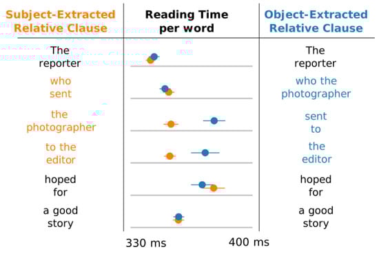 - Traxler, M.J.; Morris, R.K.; Seely, R.E. Processing subject and object relative clauses: Evidence from eye movements. J. Mem. Lang. 2002, 47, 69–90. [Google Scholar] [CrossRef]