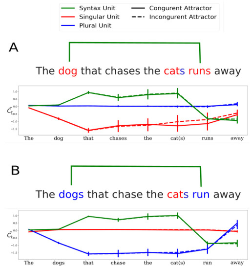 - Syntax units: units in the network whose activity is predictive of transient syntactic properties of the sentence. A particular set of syntax units was found to be predictive of the transient depth of syntactic tree, which is an index of syntactic complexity [27]. The activity of one of the syntax units was found to follow the structure of the main subject-verb dependency in various sentences (green curve in Figure 4. See also Figure 3 in Ref. [26]). Specifically, the activity of this syntax unit is positive throughout the main subject-verb dependency and changes sign only at the main verb. As discussed further below, this activity profile allows the carrying of the grammatical number of the main subject across long distances.