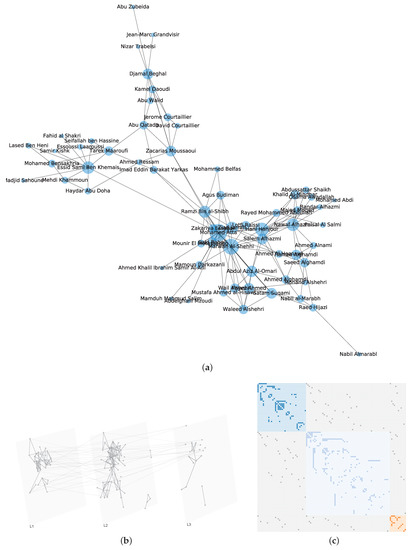 Network of 9/11 terrorists. (a) The monolayer network representation, the size of a node represents its degree; (b) The 9/11 terrorists’ interactions represented by a multilayer network model, where presents confirmed close contact, layer shows various recorded interactions, contains potential or planed or unconfirmed interactions; (c) The super-adjacency matrix representation.