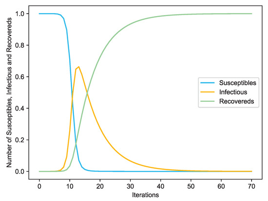 In a network, if two nodes are connected then they are considered to have “contact”. If one node is “infected”, and the other is susceptible, then with a certain probability the latter may become infected through contact [45]. A node is considered to be recovered if it is isolated or immune to the disease. In detail, to check the spreading influence of one given node, we set this node as an infected node and the other nodes are susceptible nodes. At each time step, each infected node can infect its susceptible neighbors with infection probability , and then it recovered from the diseases with probability , the differential equations are shown in Figure 2. For simplicity, we set . The process of the SIR model is plotted in Figure 3 and Figure 4 with the famous Krackhardt’s Kite network [46].