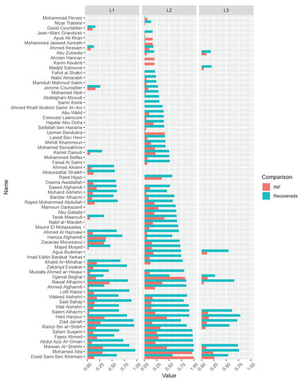 The comparison of recovered nodes in 9/11 terrorists network by initially setting every node infected separately. The recovered nodes and the corresponding INF values are normalized, which are marked in cyan and red, respectively. The comparison of the nodes in three layers are plotted in facet , and .