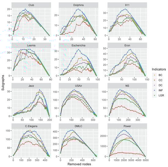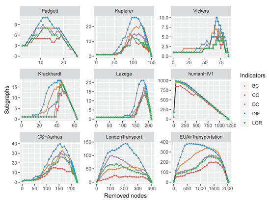 To verify the performance of the proposed node influence in networks, this paper carries out a comparison experiment on the above-mentioned datasets: The nodes were removed by a certain indicator in descending order, and the number of subgraphs was recorded. This process repeated until there were not any nodes left. The varying tendency of the subgraphs’ number exhibited the influence of a focal centrality. The experimental results are shown in Figure 7.