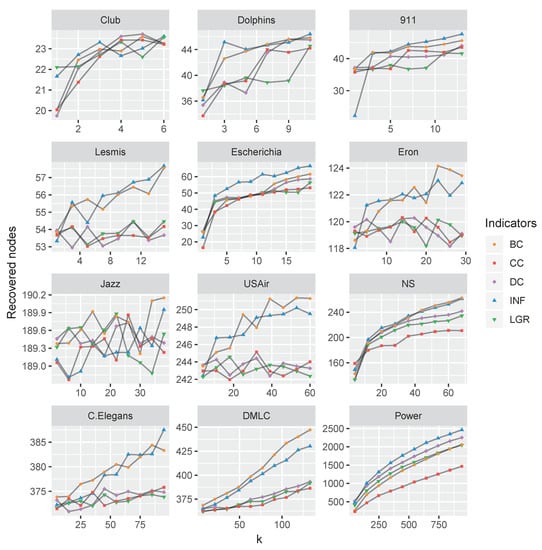 If setting the limitation of identifying k influencers, we conducted experiments on the real-world datasets with top-k nodes by computational centrality nodes and compared the recovered nodes (i.e., the final number of nodes with recovered states). To compare the varying parameter k with the obtained , we conducted experiments on the above-mentioned datasets and set the ratio of , as shown in Figure 8.