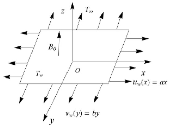 Consider a 3D MHD steady Maxwell incompressible nanofluid flow which is non-linearly thermally radiated past a stretching surface. We take a cartesian coordinate system in such a way that the and axes are directed via the stretching surface while the axis is normal to it. Considering and (where are positive real numbers) are the stretching surface velocities towards the directions of and . Here, the stretching sheet velocities vary linearly at the distance from the origin as assumed in Figure 1.