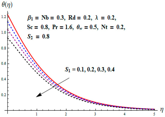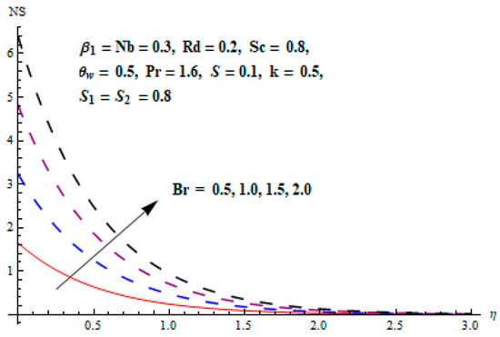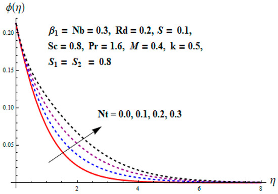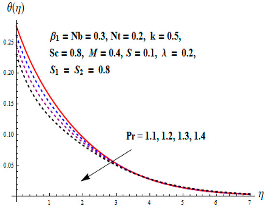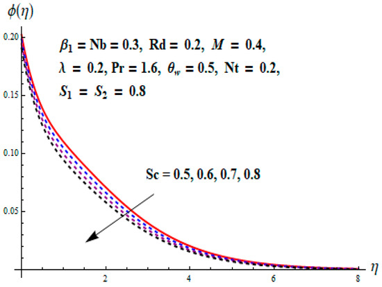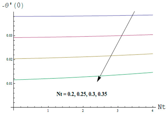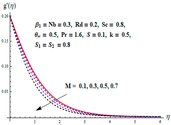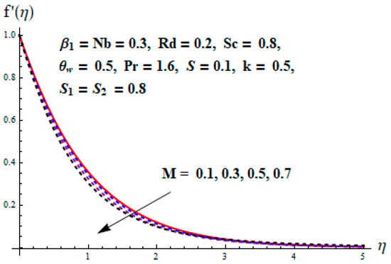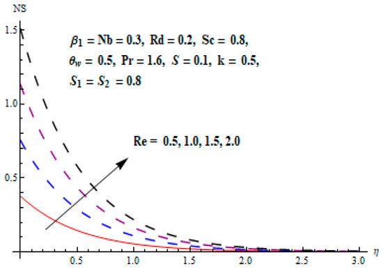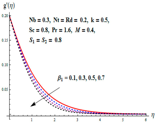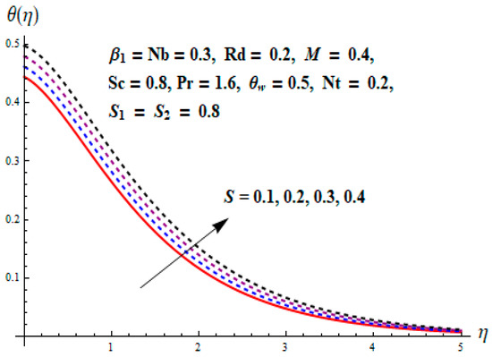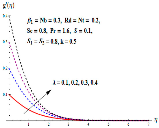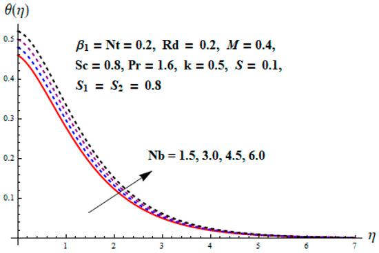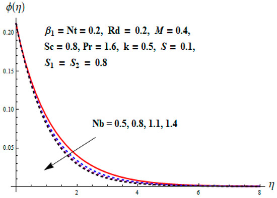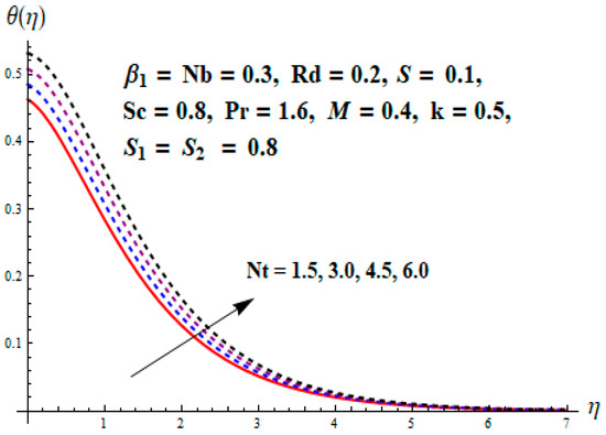 This portion focuses to discuss the important attributes of parameters versus velocity, concentration and temperature distributions. Various parameters like the magnetic parameter , Schmidt number , Deborah number , Prandtl number , Brownian motion parameter , parameter of heat absorption/generation , parameter of thermophoresis , parameter of temperature ratio , chemical reaction parameter and parameter of radiation are discussed versus velocity, temperature and concentration profiles. Deborah number effect on the velocity distribution is drawn in Figure 3. With an increment in , velocity profile decreases. When Deborah number enhances, consequently more resistance to the flow of the fluid is observed that eventually lowers the fluid velocity. Features of magnetic parameter on are sketched in Figure 4. We concluded that the decreases for large . Relatively larger estimates of results in strong Lorentz force that obstructs the movement of the fluid flow. Thus, the decline in the velocity of the fluid is witnessed. Effects of Deborah number on velocity distribution along vertical axis i.e., are shown in Figure 5. Velocity decreases for larger . As, is the proportion of relaxation and observation times, so relaxation time increase when Deborah number enhances. Consequently, more resistance provided to the flow of the fluid that lowers the velocity. The case reflects Newtonian fluid. Figure 6 is drawn to show the impact of on the velocity profile along the vertical axis. Here, the same logic may be added as in the case of Figure 4. Further, leads to a hydrodynamic flow situation. Change in the velocity field for various estimations of ratio parameter λ is drawn in Figure 7. For mounting estimations of ratio parameter thickness and velocity of the thermal layer shows the higher behavior. Figure 8 demonstrates the effect of Prandtl number on temperature profile . We found that the profile becomes lower for large variations of . As represents the rate of thermal and momentum diffusivities. Increment in Prandtl number enhances the momentum diffusivity and declines the thermal diffusivity. That affects the temperature of the fluid and eventually decay in the temperature of the fluid is witnessed. Figure 9 is drawn to portray the impact of the thermophoresis parameter on temperature profile . When the value of is enhanced, the temperature and thermal layer thickness both increases. If we increase the thermophoresis parameter , it causes a raise in the force of thermophoresis, which pushes the nanoparticles from hotter to the colder surface, thus an improvement in the temperature of the fluid is seen. Figure 10 illustrates an upsurge in the temperature profile versus increment in the Brownian motion parameter . The motion of fluid particles rises when enhances. As a result, more heat generates which boosts the temperature. Figure 11 depicts the behavior of fluid temperature for the temperature ratio parameter . Here is increasing . Figure 12 plotted to show the curves of for various estimates of radiation parameter . Generally, in the process of radiation, heat is generated in the moving liquid, which causes a rise in the thermal field. Figure 13 indicates distinct estimations of heat absorption/generation parameter for different variations in temperature profile . Here, leads to the generation of heat and correspond to the absorption of heat. It is seen that values of and thickness of the thermal layer is higher in the case of heat generation as we see in the situation of heat absorption. Figure 14 is drawn to examine the temperature difference for various variations of thermal stratification parameter . Here, we noticed that the temperature is a diminishing function of . Figure 15 is plotted to show that by increasing Schmidt number decay in concentration distribution found. The coefficient of Brownian diffusion and the Schmidt number is related inversely with each other. Greater estimations of Schmidt number give rise to a lower coefficient of Brownian diffusion, which reduces the concentration distribution of nanoparticles. Figure 16 displays the increasing impact of thermophoresis parameter on the concentration profile . The thermophoresis is inversely related to the viscous force. Stronger means the weaker viscous forces. Thus, a rise in the concentration of the fluid is seen. The descending behavior in for a parameter of Brownian motion is drawn in Figure 17. The Brownian motion arises due to the flow of a nanofluid in the existence of nanoparticles. An increment in affects the Brownian motion, and it reduces the boundary layer thickness. Figure 18 describes the behavior of concentration field versus chemical reaction parameter . Mounting values of chemical reaction parameter relate to the reduction in nanoparticle distribution. Figure 19 indicates the significant aspects of solutal or concentration stratification parameter on . Concentration relates the decaying nature with the intensity of solutal stratification. Because of a large disturbance in molecules of fluid, the reduction in solute nanoparticle concentration occurs which causes decay in concentration profile . Figure 20 and Figure 21 show important characteristics of volumetric entropy generation versus Brinkman number and Reynold number respectively. The Brinkman number predicts the relative significance of resistive impacts and as it is witnessed that the increment in results in entropy increase. The Reynolds number also plays a crucial part in generating higher entropy. The enhancement of Reynolds number backs the contribution of the entropy generation number due to liquid friction and the transfer of heat in the boundary layer. Therefore, the increase in Reynolds number interrupts the liquid flow, and then chaos (disturbance) appears in the liquid.