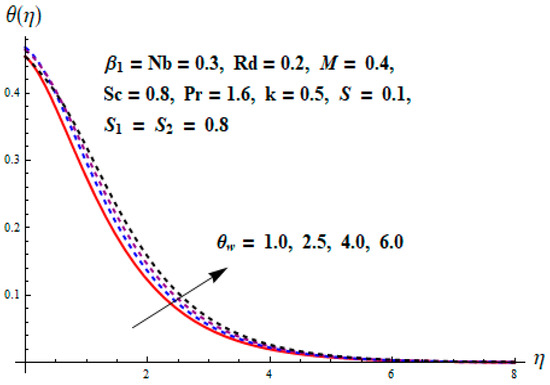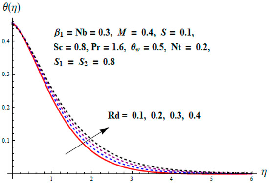 The effect of non-linear thermal radiation on fluid flows has been conversed by researchers because of its applications, such as in solar ponds, solar collectors, gas turbines, furnace design, photochemical reactors, turbid water bodies, nuclear power plants, and the various propulsion devices for missiles, satellites, aircraft, and space vehicles, as examples of engineering areas. Recently many researchers have explored the thermal radiation impact in heat transfer processes of both conventional and nanofluids over-stretching surfaces. The effects of non-linear thermal radiation and chemical reaction past an Eyring Powell nanofluid flow with variable thermal conductivity are investigated by Ramzan et al. [44]. Radiative magnetohydrodynamic nanofluid flow due to gyrotactic microorganisms with chemical reactions and non-linear thermal radiation is explored by Ramzan et. al [45]. The impact of magnetohydrodynamic on the three-dimensional flow of a viscoelastic nanofluid in the existence of nonlinear thermal radiation is analyzed by Hayat et. al [46]. The Oldroyd-B fluid flow under the influence of radiative heat flux and homogeneous–heterogeneous reactions at a convective heat surface is studied by Lu et al. [47]. It is notified by them that fluid temperature is enhanced versus escalating estimates of Biot number. Bilal et al. [48] analyzed the Hall current impact on a time-dependent rotational fluid flow comprising carbon nanotubes over a convectively heated surface. The additional effects affecting the fluid are nonlinear thermal radiation in a Darry–Forchheimer porous media. Some more recent publications discussing radiative heat flux are referred at [49,50,51,52].