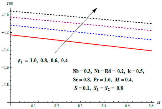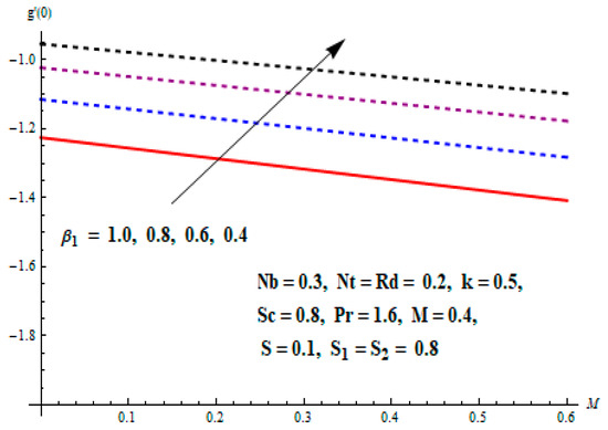 Effects of Deborah number with respect to relaxation time and magnetic parameter on Skin friction coefficient of velocity distributions are portrayed in Figure 22 and Figure 23. It is perceived that Skin friction coefficient is an increasing function of and in both cases. The influence of and on heat transfer rate is shown in Figure 24. It can be seen that the heat transfer rate decreases with the increasing values of and .