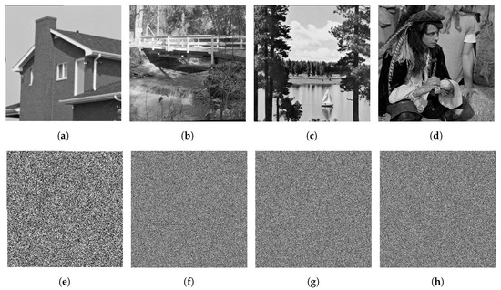 In this section the current scheme is implemented on all gray images of the USC-SIPI Image Database [56]. The USC-SIPI database contains images of size , m = 256,512,1024. Furthermore, some security analyses that are explained one by one in the associated subsections are presented. To validate the quality of the proposed scheme, the experimental results are compared with some other encryption schemes. The parameters used for the experiments are and for m = 256,512,1024, respectively; = 90,000 and varies for each P. The experiments were performed using Matlab R2016a on a personal computer with a GHz Processor and 6 GB RAM. All encrypted images of the database along with histograms are available at [57]. Some plain images, House, Stream, Boat and Male and their cipher images are displayed in Figure 1.