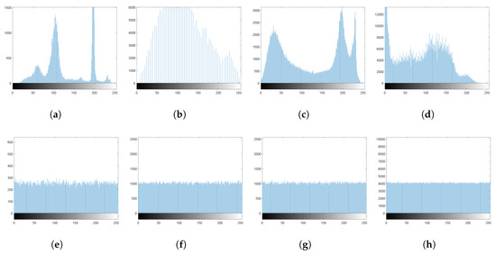 - Known-plaintext/chosen-plaintext attack. In a known-plaintext attack, the attacker has partial knowledge about the plain image and cipher image, and tries to break the cryptosystem, while in a chosen-plaintext attack the attacker encrypts an arbitrary image to get the encryption keys. An all-white/black image is usually encrypted to test the performance of a scheme against these powerful attacks [29,58]. We analyzed our scheme by encrypting an all-white/black image of size . The results are shown in Figure 6 and Table 10, revealing that the encrypted images are significantly randomized. Thus the proposed system is capable of preventing the above mentioned attacks.