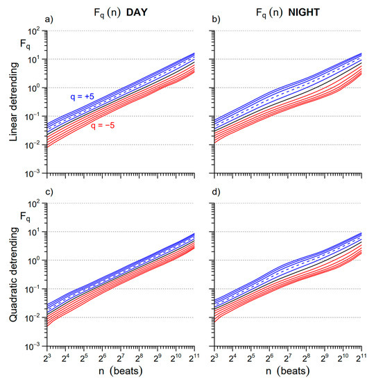By contrast, night–day changes at shorter scales affect heart rate and blood pressure differently. While short-term coefficients of blood pressure are greater at night for moment orders q ≥ 2, the main modulation of short-term scales of heart rate consists of lower values at night for −3 ≤ q ≤ 0 (Figure 4a). Further studies controlling the effects of posture and physical activity are needed to understand the nature of so different night/day changes between heart rate and blood pressure.