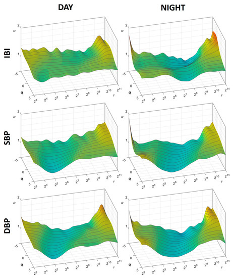 Figure 2 shows the α(q,τ) surfaces for IBI, SBP, and DBP, separately, during Day and Night periods (average over the group of patients). The figure suggests the presence of structural differences between heart rate and blood pressure in their complex dynamics: during the daytime, these differences appear particularly clear between 16 and 256 s, where IBI appears characterized by a relatively flat surface at all q orders while SBP and DBP show a dip around τ = 32 s for positive q orders.