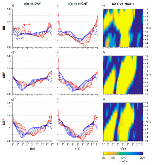 Day–Night comparison of cross sections of multifractal multiscale DFA coefficients. (a) Cross sections of α(q,τ) of IBI for scales τ between 8 and 2048 s and moment orders q between −5 and +5: average over the group of 14 participants in the Day subperiod; q < 0 in red, q > 0 in blue, q = 0 in black; the dotted line is α for q = 2 (second order moment of the monofractal DFA); (b) α(q,τ) of IBI as in panel (a) for the Night subperiod; (c) color map representing the statistical significance (p value) of the Day vs. Night comparison of IBI scale coefficients calculated at each τ and q after the Wilcoxon signed rank test; (d) α(q, τ) of SBP in the Day subperiod represented as in panel (a); (e) α(q, τ) of SBP in the Night subperiod represented as in panel (a); (f) color map of the Day vs. Night statistical significance for SBP scale coefficients; (g) α(q, τ) of DBP during Day represented as in panel (a); (h) α(q, τ) of DBP during Night represented as in panel (a); (i) color map of the Day vs. Night statistical significance for DBP coefficients.